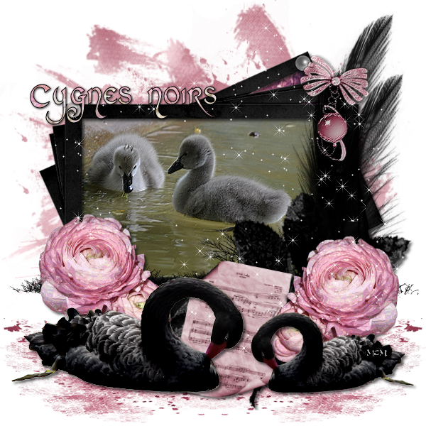C'est un couple de cygnes noirs avec de belles plumes luisantes, sous un ciel étoilé par de myriades petites étoiles scintillantes.